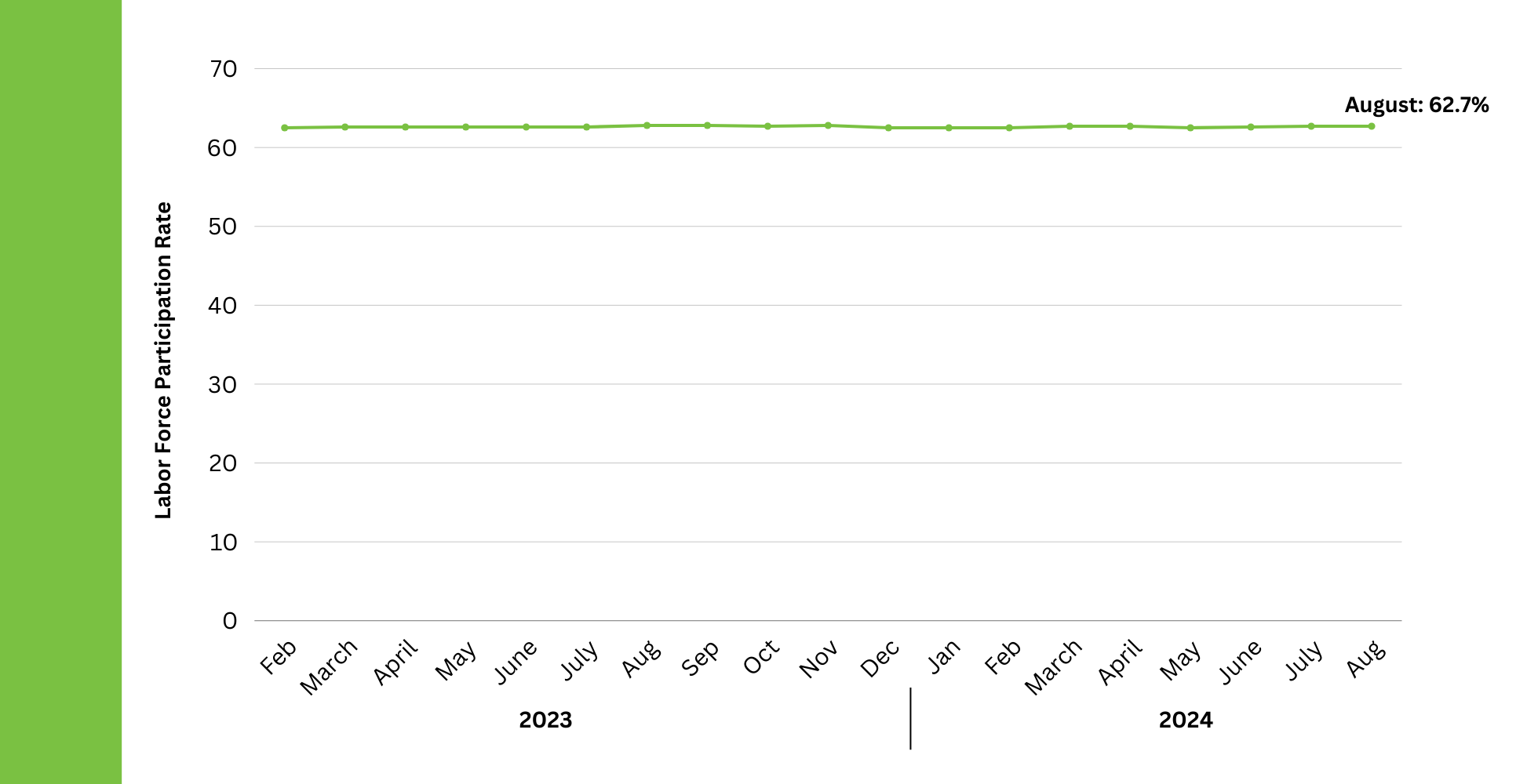The labor force participation rate remained at 62.7% in August and has changed slightly over the year.