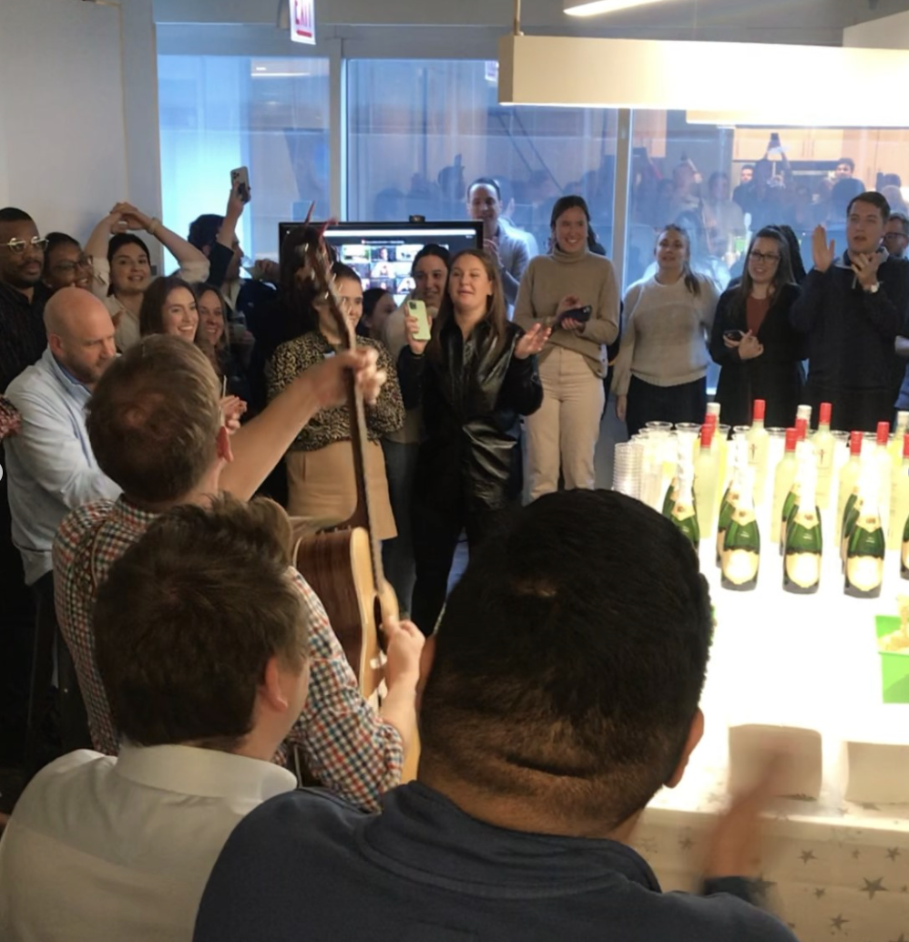 After celebrating LaSallians ReBirthdays (work anniversaries) virtually for the last two years, festivities are finally back in-person! At each of our offices, LaSallians gather once a week to recognize their peers for achieving another year with LaSalle, which include a speech by the LaSallian and their manager. These are also live streamed so those virtually can join and celebrate, too! Sometimes we have surprise guests break out with a guitar to help us sing “Happy ReBirthday” as seen in the picture above ?