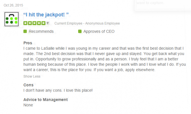 We’re not perfect; every company has its flaws, and LaSalle is no different. But we strive to learn, and grow: we listen to our employees and candidates, and we try to get better every day.